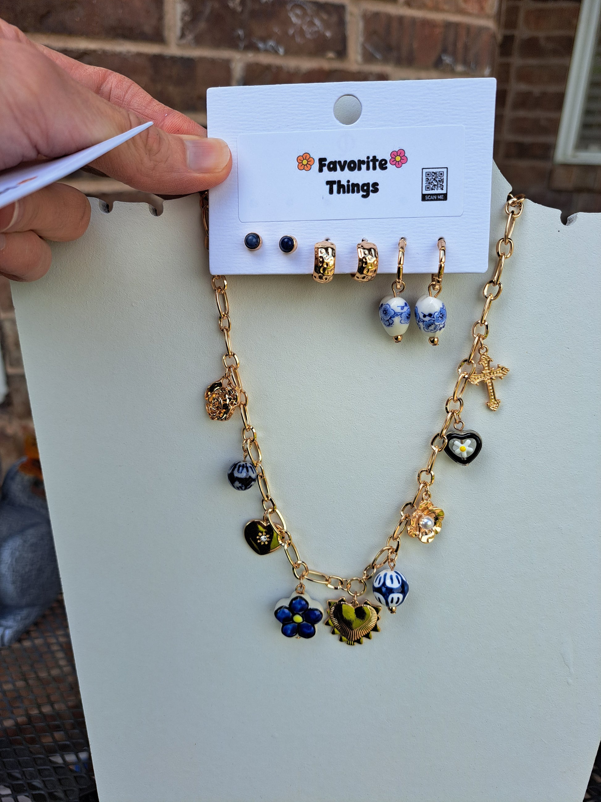 Features ceramic porcelain toile pattern charms, flower, ball, heart and cross charm, elegantly suspended on a link chain