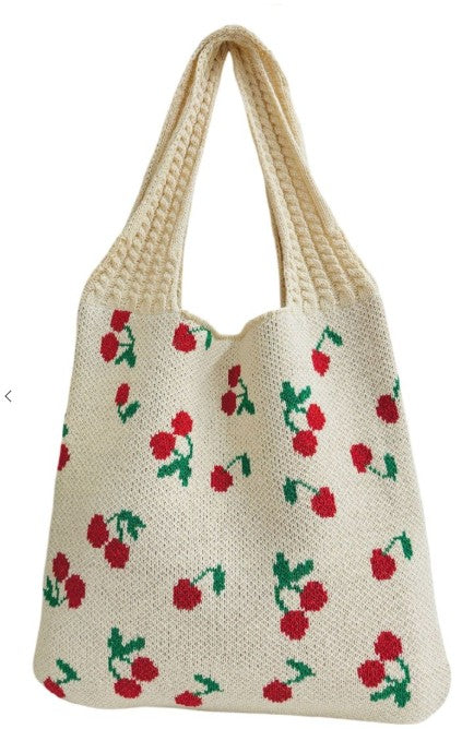 Knitted Woven Cream Crochet Tote Bag With Cherries