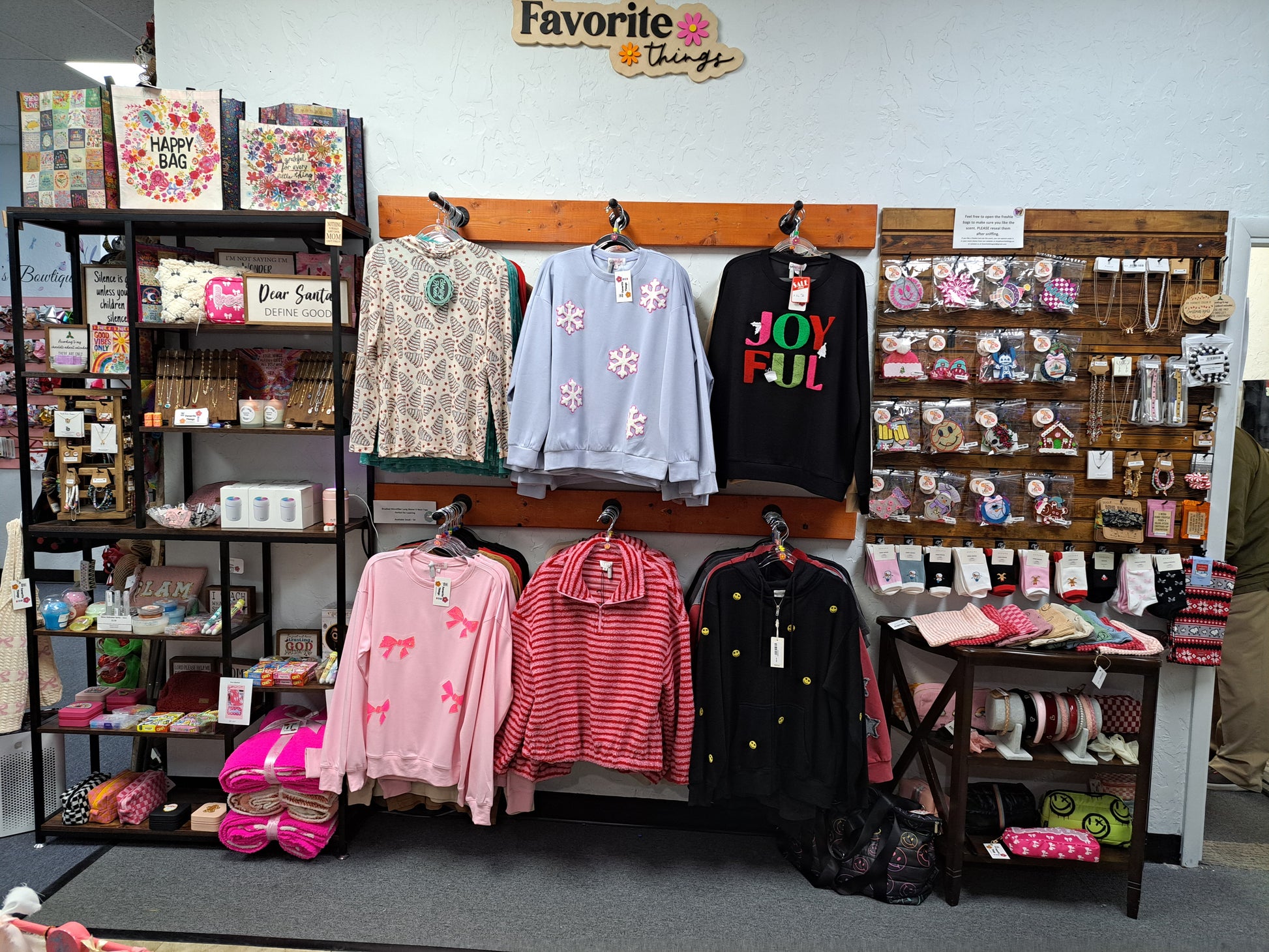This one-of-a-kind pullover features chenille snowflake patches sewn on with a pink sequin outline.
